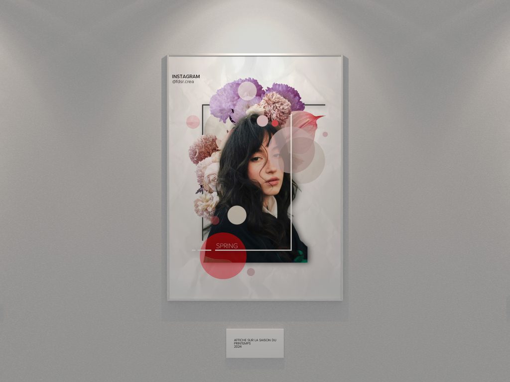 J’y ai mis un soin particulier dans le détourage et l’équilibre visuel, pour faire dialoguer le visage, les fleurs et les cercles colorés dans une composition à la fois douce et dynamique.