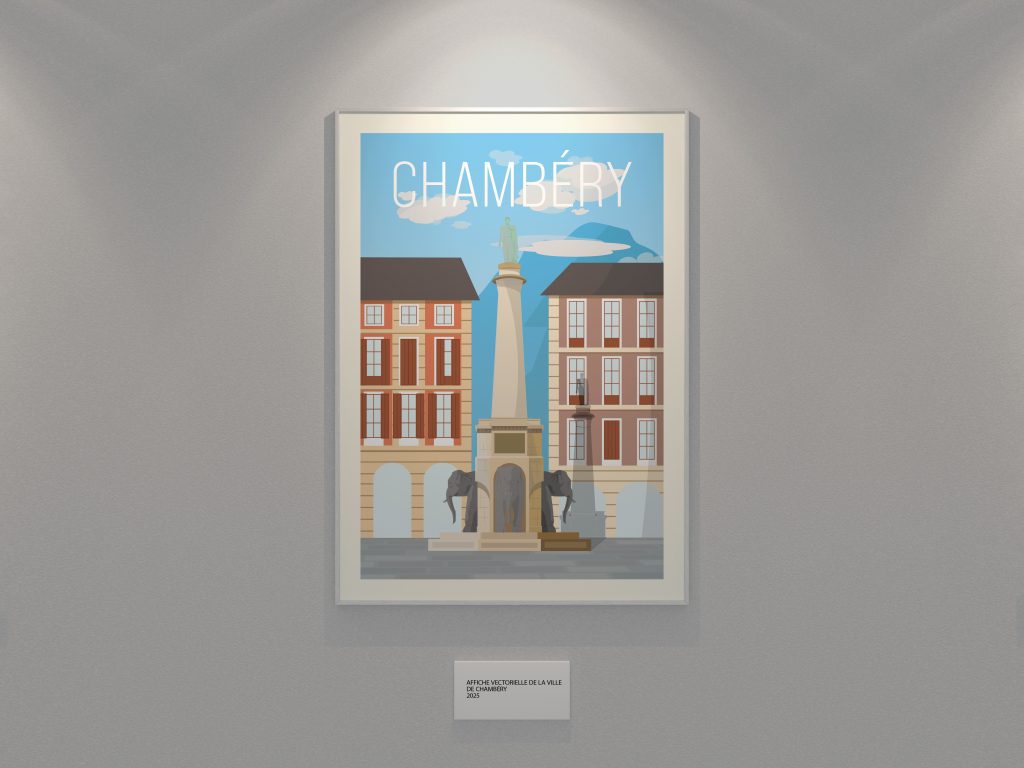 Située au cœur de la ville, dans l’axe du château des Ducs de Savoie, cette fontaine fait partie du paysage chambérien autant que de ses souvenirs. J’ai voulu en proposer une interprétation graphique épurée, qui mêle attachement personnel et regard visuel.